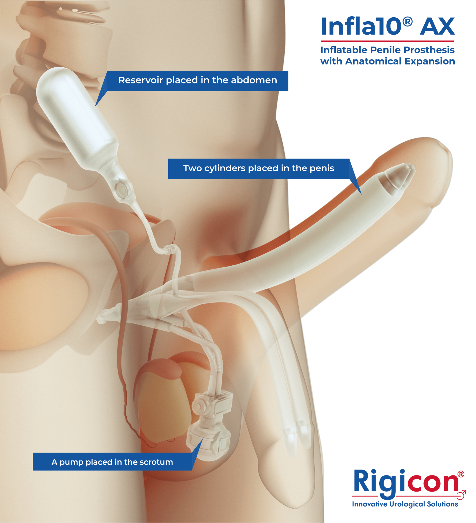 Rigicon offers the Infla10® three-piece inflatable penile prostheses for men who need surgical intervention to treat erectile dysfunction (ED).